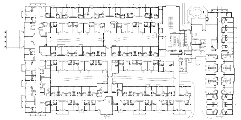 A senior's facility located on a healthcare campus, including an attached wing housing residents with memory care needs.